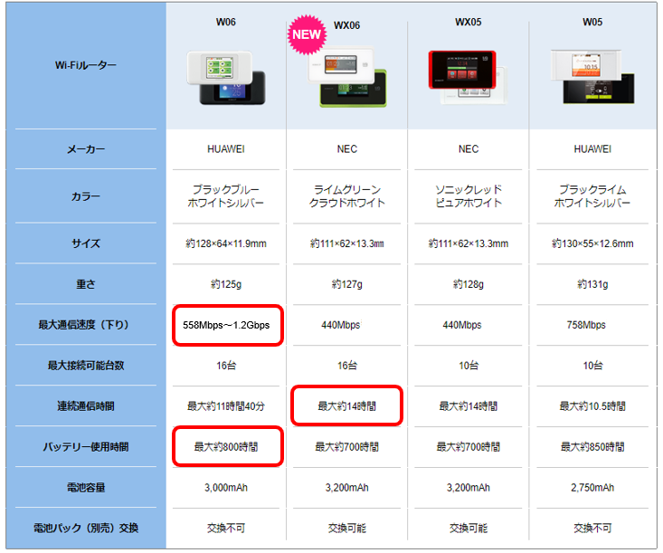 最新端末「WX06」は、現行端末の中で通信時間が一番長いという長所はあるものの、その他スペックは前身の「WX05」とほぼ同じで、通信速度も「W06」より118Mbpsも遅いのです。